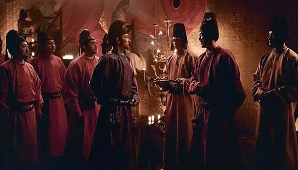 李善德要跑通各個衙門要錢要人要馬匹時,就像一個大廠員工為了完成項目,跑財務(wù)、人力、技術(shù)、市場等部門,各個部門把鍋甩得滿天飛,他只能仰頭長嘆,不知道從何理起這團(tuán)亂麻。電影里也將大唐朝堂幾乎拍成了一個大廠員工跑寫字樓的構(gòu)圖和視覺效果,上上下下,見了各種嘴臉,李善德站在一個圓圈的中間愁眉苦臉。閉環(huán)的意思,原來是讓人無路可走。